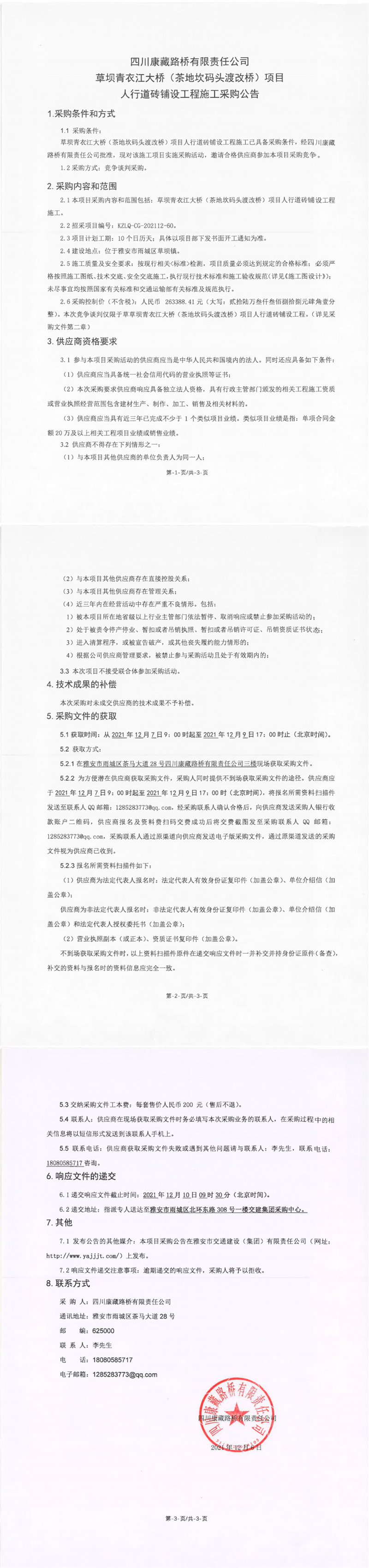 四川康藏路橋有限責任公司草壩青衣江大橋(茶地坎碼頭渡改橋)項目人行道磚鋪設工程施工采購公告