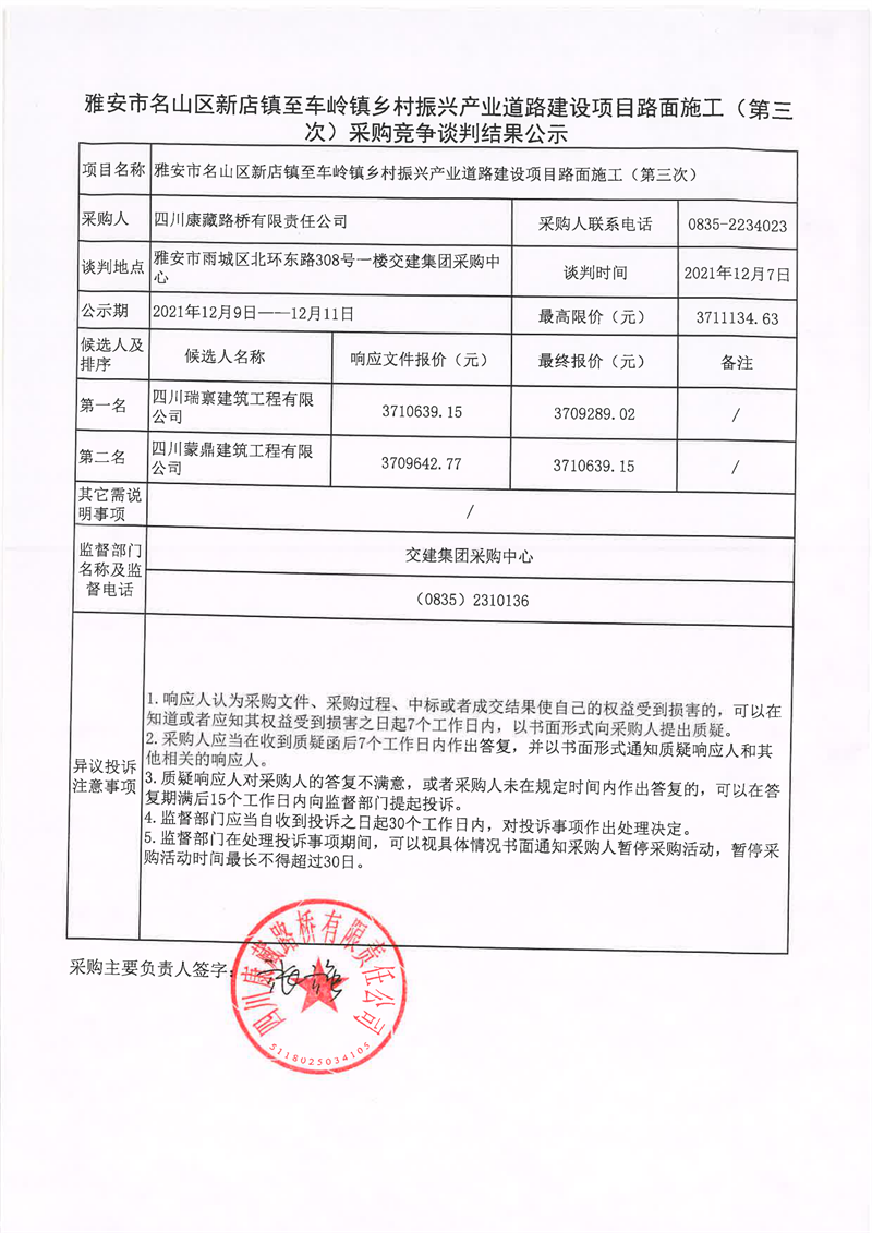四川康藏路橋有限責(zé)任公司雅安市名山區(qū)新店鎮(zhèn)至車嶺鎮(zhèn)鄉(xiāng)村振興產(chǎn)業(yè)道路建設(shè)項(xiàng)目路面施工(第三次)采購(gòu)競(jìng)爭(zhēng)談判結(jié)果公示