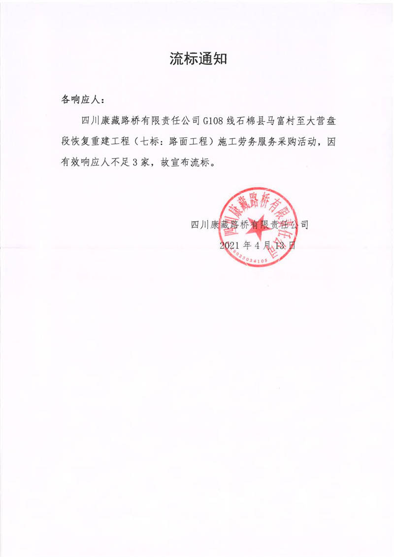 四川康藏路橋有限責(zé)任公司G108線石棉縣馬富村至大營盤段恢復(fù)重建工程(七標:路面工程)施工勞務(wù)服務(wù)流標通知