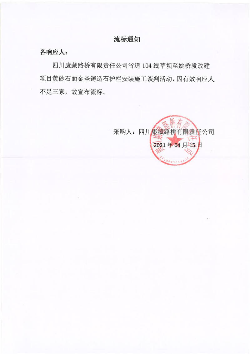 四川康藏路橋有限責(zé)任公司省道104線草壩至姚橋段改建項目黃砂石面金圣鑄造石護欄安裝施工流標(biāo)通知