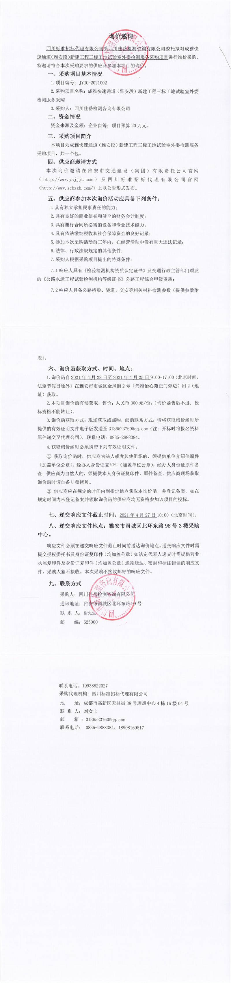 四川佳岳檢測(cè)咨詢有限公司成雅快速通道(雅安段)新建工程三標(biāo)工地試驗(yàn)室外委檢測(cè)服務(wù)采購(gòu)詢價(jià)公告