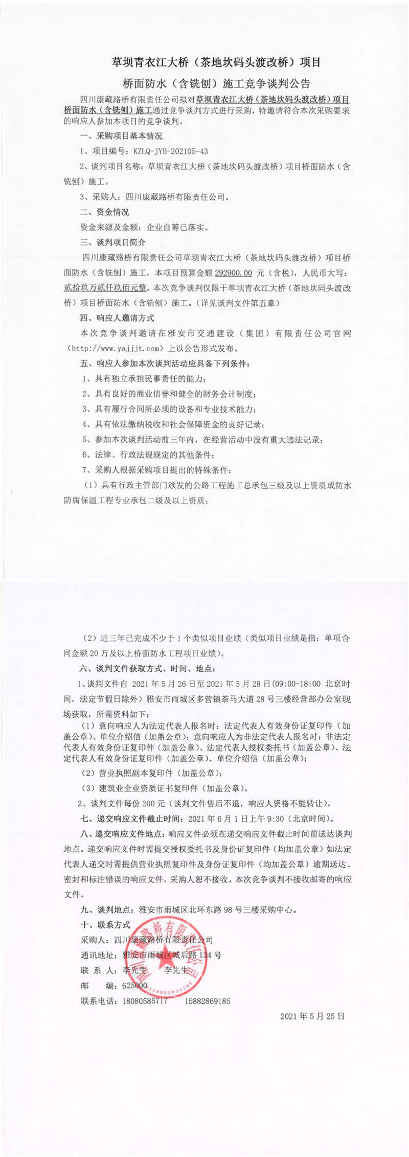 四川康藏路橋有限責(zé)任公司草壩青衣江大橋(茶地坎碼頭渡改橋)項目橋面防水(含銑刨)施工競爭談判公告