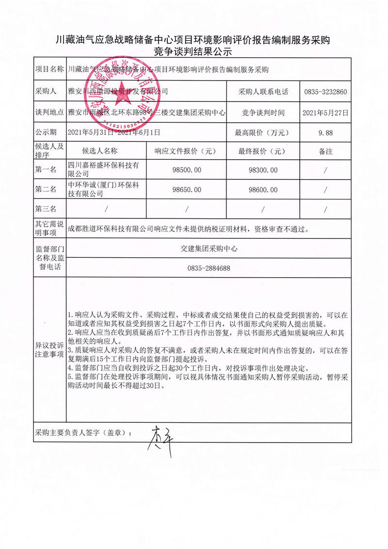 雅安川西能源投資開發(fā)有限公司川藏油氣應急戰(zhàn)略儲備中心項目環(huán)境影響評價報告編制服務采購競爭性談判結(jié)果公示