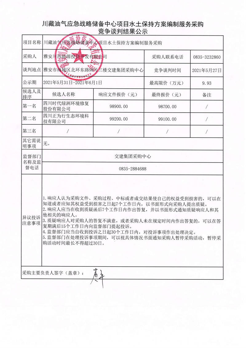 雅安川西能源投資開發(fā)有限公司川藏油氣應(yīng)急戰(zhàn)略儲(chǔ)備中心項(xiàng)目水土保持方案編制服務(wù)采購競爭談判結(jié)果公示