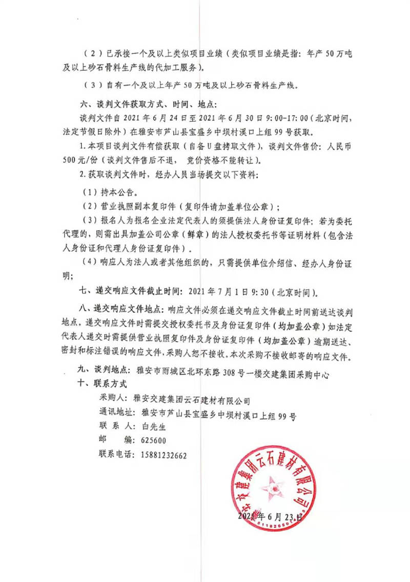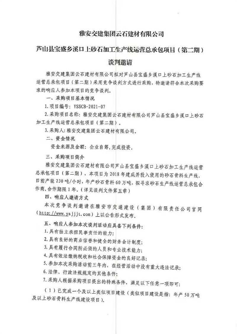 雅安交建集團(tuán)云石建材有限公司蘆山縣寶盛鄉(xiāng)溪口上砂石加工生產(chǎn)線運(yùn)營總承包項(xiàng)目(第二期)競爭談判公告