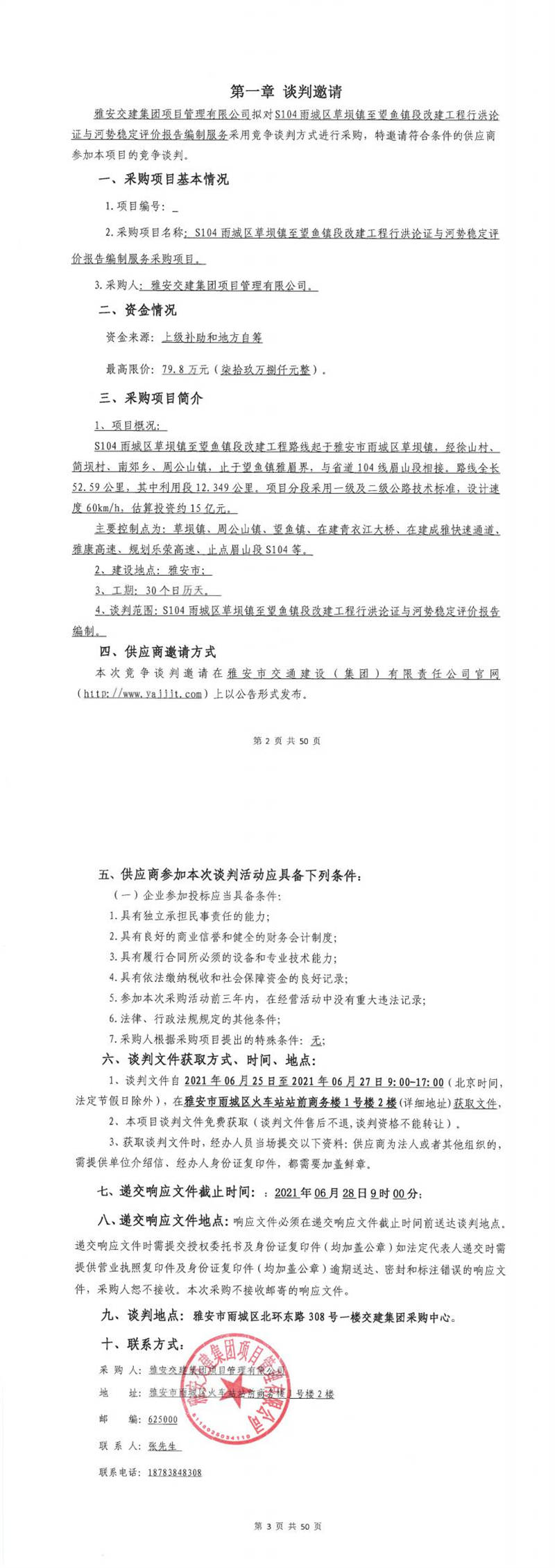 雅安交建集團(tuán)項(xiàng)目管理有限公司S104雨城區(qū)草壩鎮(zhèn)至望魚鎮(zhèn)段改建工程行洪論證與河勢(shì)穩(wěn)定評(píng)價(jià)報(bào)告編制服務(wù)采購(gòu)項(xiàng)目競(jìng)爭(zhēng)談判公告