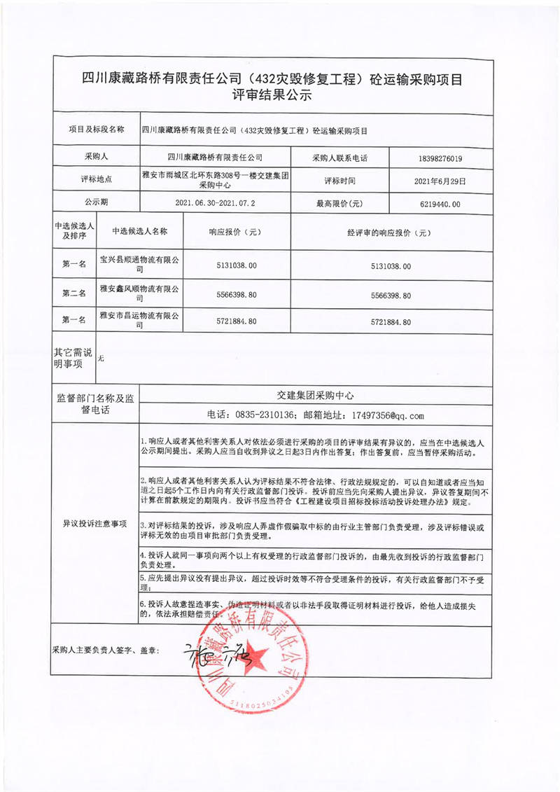 四川康藏路橋有限責(zé)任公司S432線寶興縣兩河口至甘孜界段災(zāi)毀修復(fù)整治工程砼運輸采購項目評審結(jié)果公示