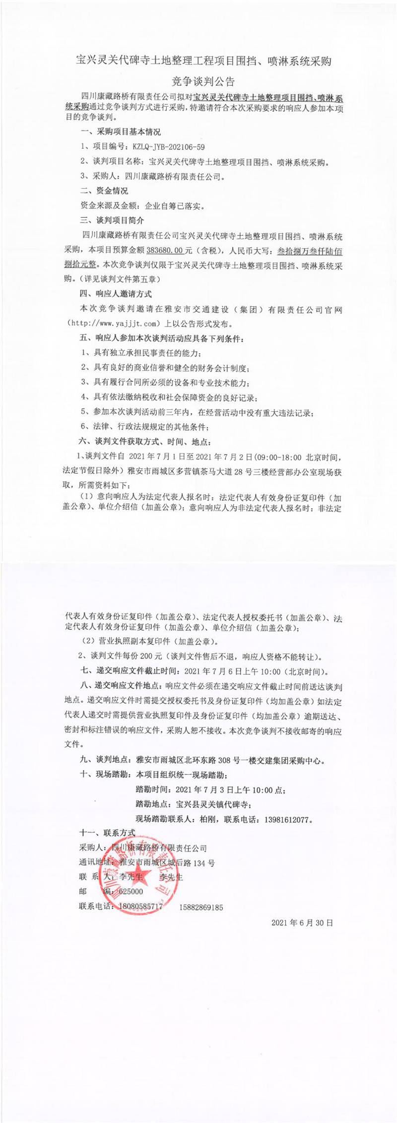 四川康藏路橋有限責(zé)任公司寶興靈關(guān)代碑寺土地整理工程項目圍擋、噴淋系統(tǒng)采購競爭談判公告