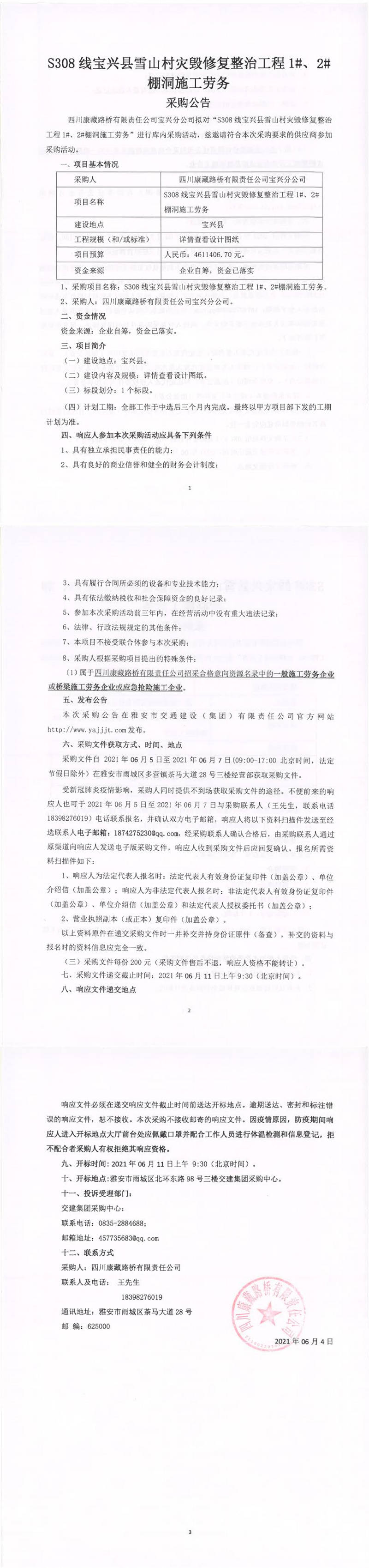 四川康藏路橋有限責(zé)任公司S308線寶興縣雪山村災(zāi)毀修復(fù)整治工程1#、2#棚洞施工勞務(wù)采購(gòu)公告