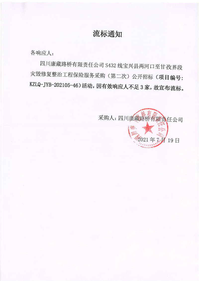 四川康藏路橋有限責(zé)任公司S432線寶興縣兩河口至甘孜界段災(zāi)毀修復(fù)整治工程保險(xiǎn)服務(wù)采購(第二次)流標(biāo)通知