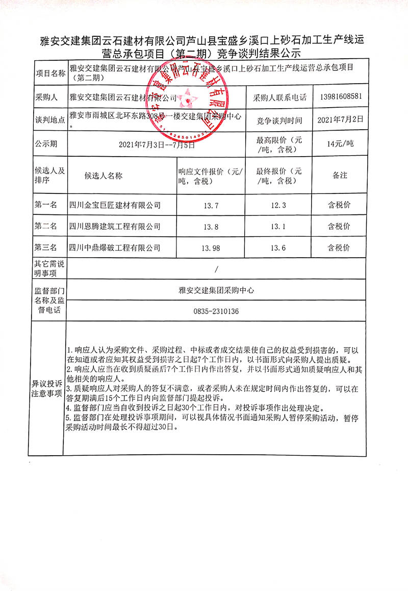 雅安交建集團云石建材有限公司蘆山縣寶盛鄉(xiāng)溪口上砂石加工生產(chǎn)線運營總承包項目(第二期)競爭談判結(jié)果公示