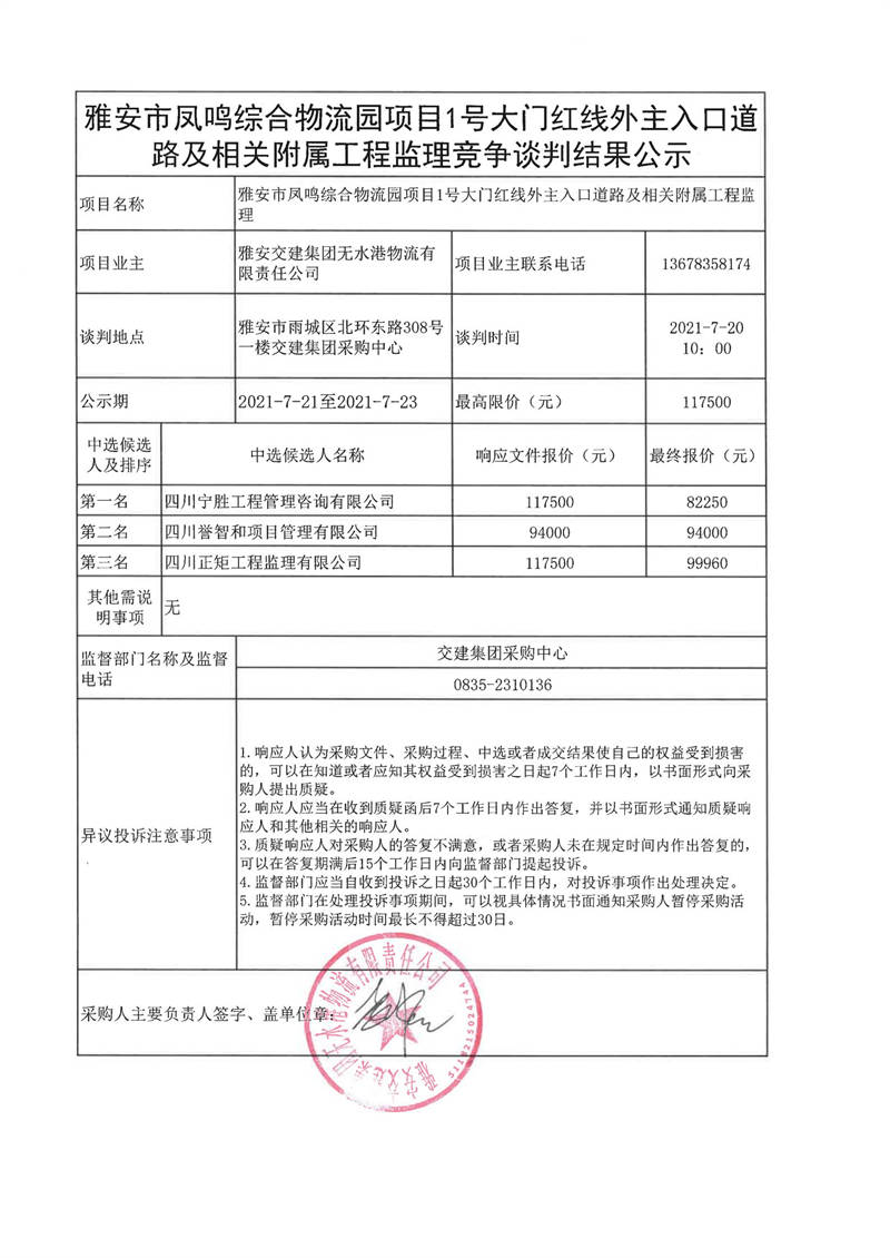 雅安交建集團無水港物流有限責任公司雅安市鳳鳴綜合物流園項目1號大門紅線外主入口道路及相關附屬工程監(jiān)理競爭談判結果公示