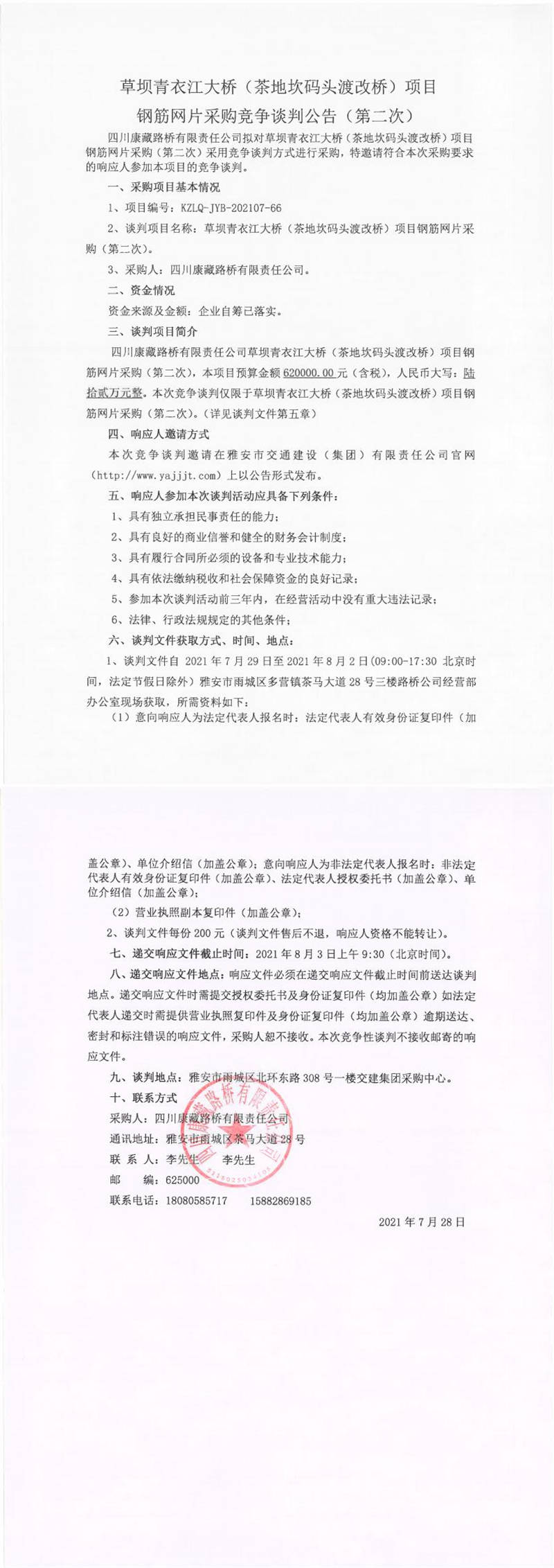 四川康藏路橋有限責(zé)任公司草壩青衣江大橋(茶地坎碼頭渡改橋)項(xiàng)目鋼筋網(wǎng)片采購競爭談判公告(第二次)