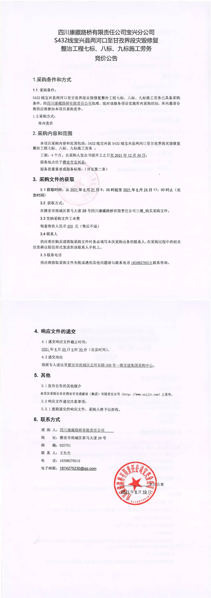 四川康藏路橋有限責任公司寶興分公司S432線寶興縣兩河口至甘孜界段災(zāi)毀修復(fù)整治工程七標、八標、九標施工勞務(wù)競價公告