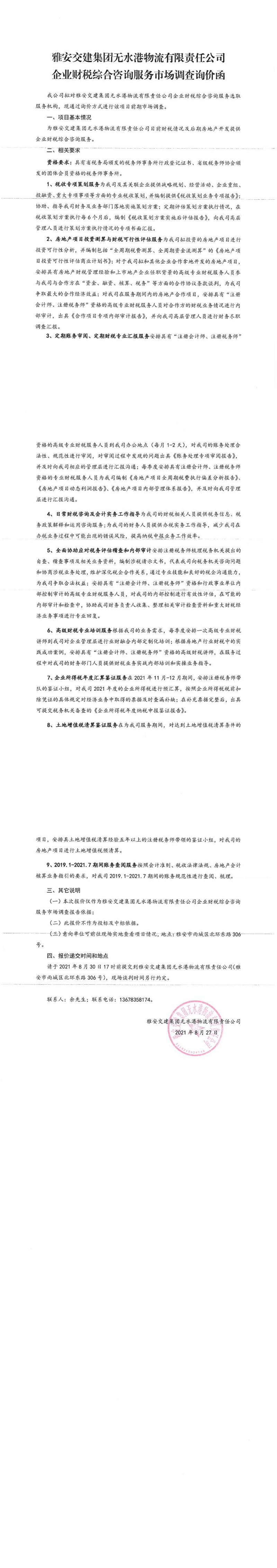 雅安交建集團(tuán)無(wú)水港物流有限責(zé)任公司企業(yè)財(cái)稅綜合咨詢(xún)服務(wù)市場(chǎng)調(diào)查詢(xún)價(jià)函