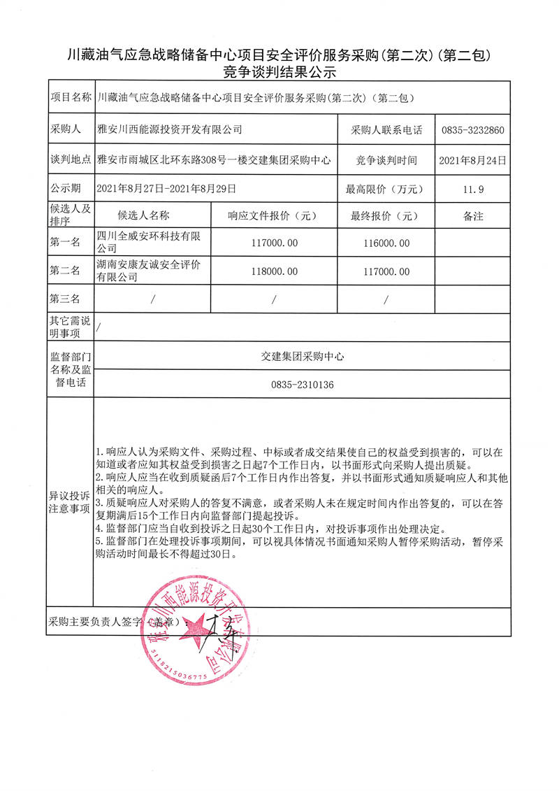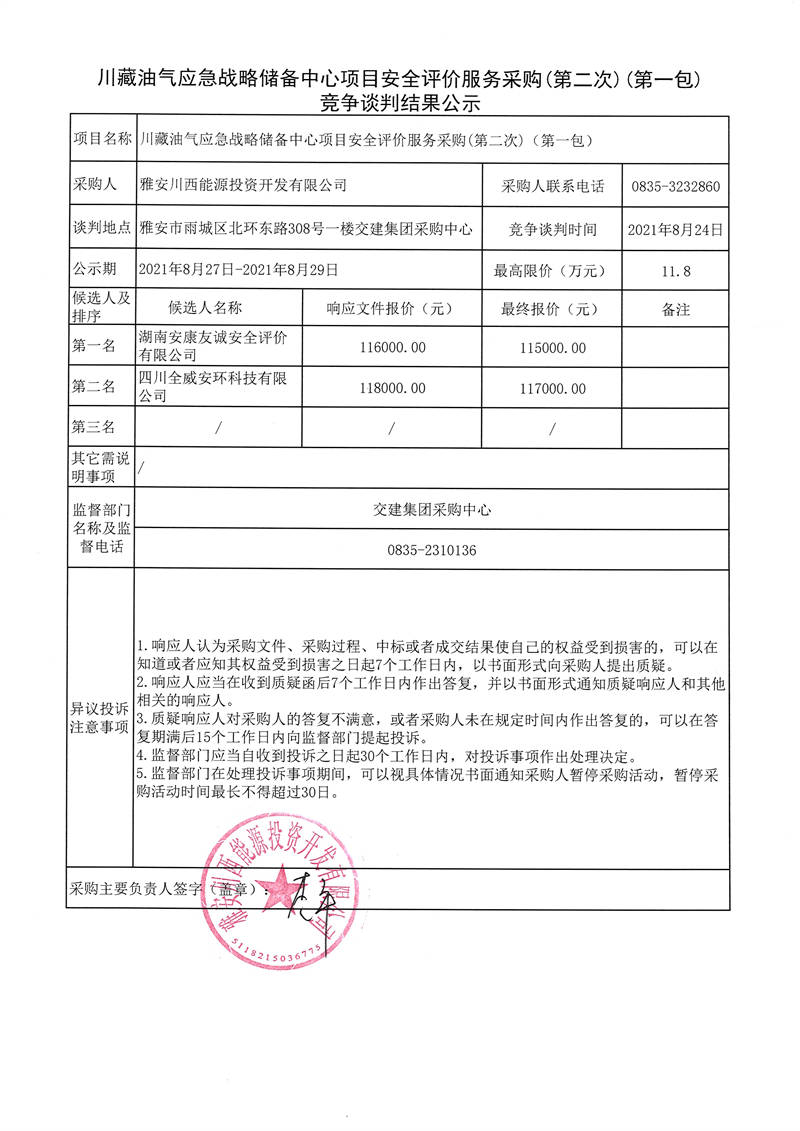 川藏油氣應(yīng)急戰(zhàn)略儲備中心項(xiàng)目安全評價服務(wù)采購(第二次)(第一包、第二包)競爭談判結(jié)果公示