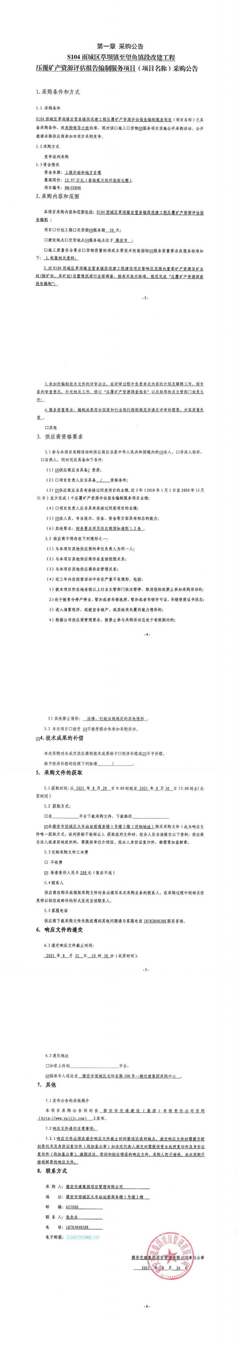 雅安交建集團項目管理有限公司S104雨城區(qū)草壩鎮(zhèn)至望魚鎮(zhèn)段改建工程壓覆礦產資源評估報告編制服務項目采購公告