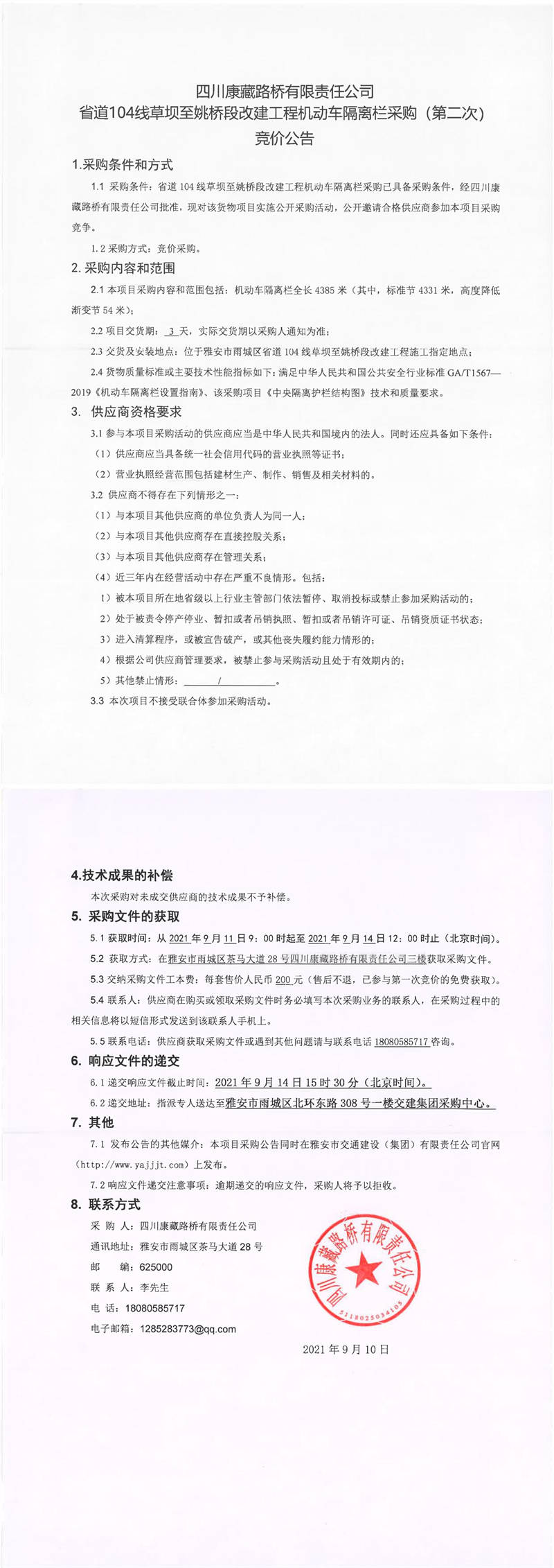 四川康藏路橋有限責(zé)任公司省道104線草壩至姚橋段改建工程機(jī)動車隔離欄采購(第二次)競價公告