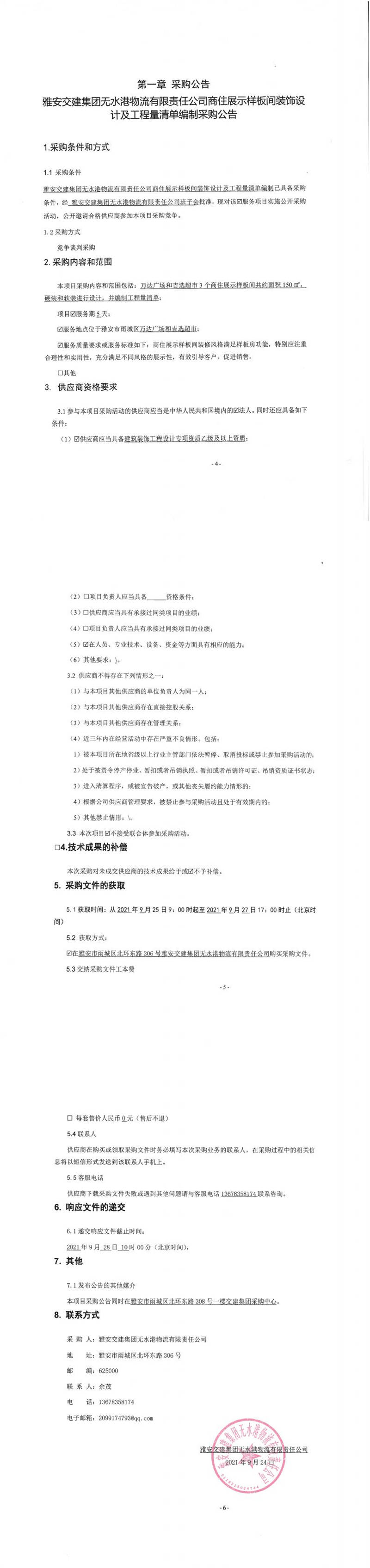 雅安交建集團無水港物流有限責任公司商住展示樣板間裝飾設計及工程量清單編制采購公告