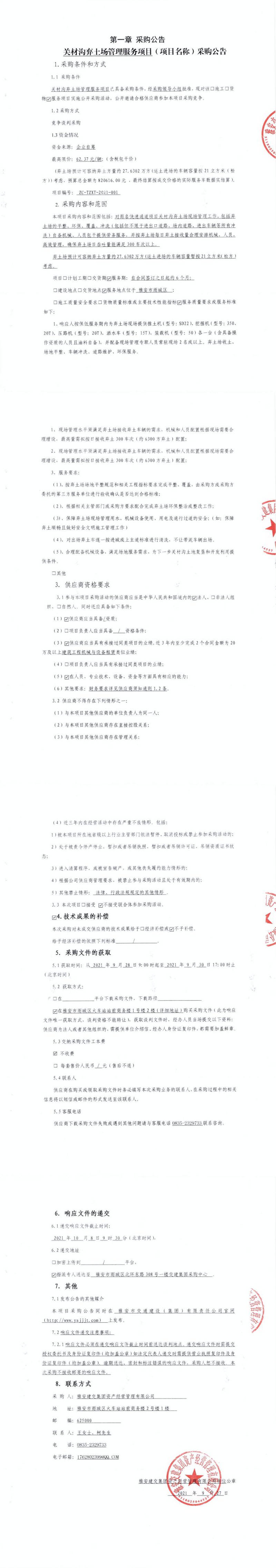 雅安交建集團(tuán)資產(chǎn)經(jīng)營管理有限公司關(guān)材溝棄土場管理服務(wù)項目采購公告