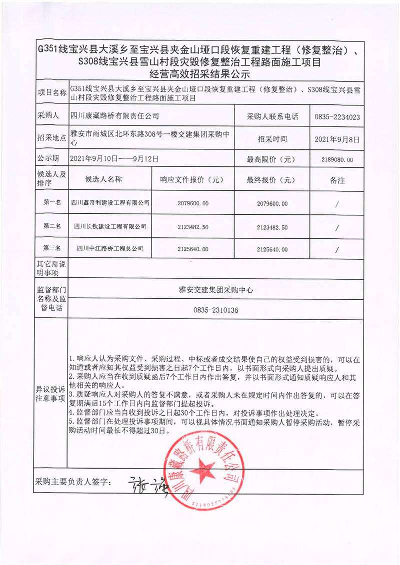 四川康藏路橋有限責(zé)任公司G351線寶興縣大溪鄉(xiāng)至寶興縣夾金山啞口段恢復(fù)重建工程(修復(fù)整治)、S308線寶興縣雪山村段災(zāi)毀修復(fù)整治工程路面施工項(xiàng)目經(jīng)營(yíng)高效招采結(jié)果公示