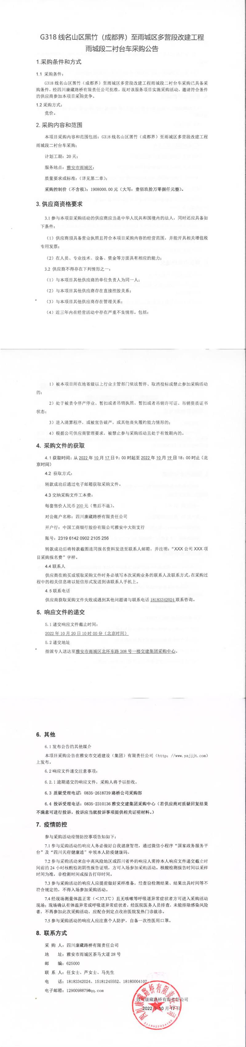 四川康藏路橋有限責(zé)任公司G318線名山區(qū)黑竹(成都界)至雨城區(qū)多營(yíng)段改建工程雨城段二襯臺(tái)車(chē)采購(gòu)公告