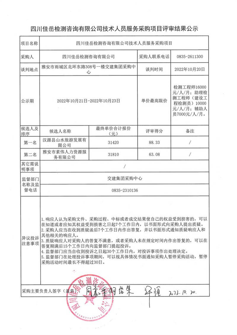 四川佳岳檢測咨詢有限公司技術(shù)人員服務(wù)采購項(xiàng)目評(píng)審結(jié)果公示