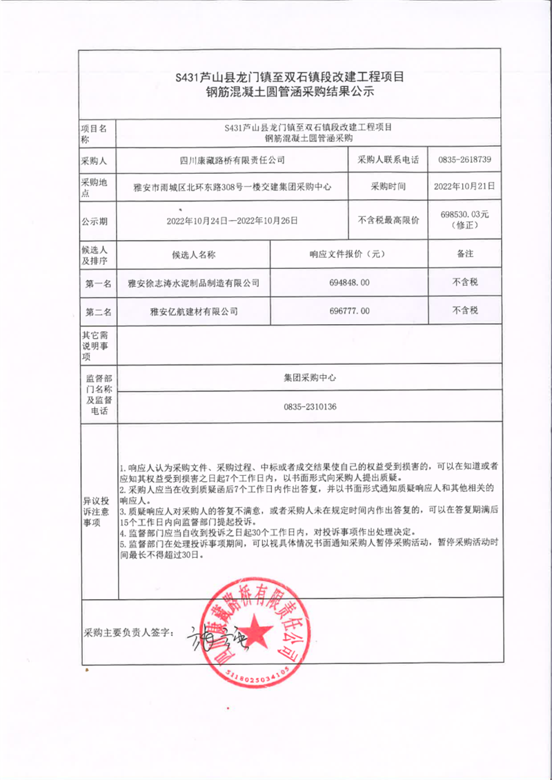 四川康藏路橋有限責(zé)任公司S431蘆山縣龍門鎮(zhèn)至雙石鎮(zhèn)段改建工程項(xiàng)目鋼筋混凝土圓管涵采購結(jié)果公示