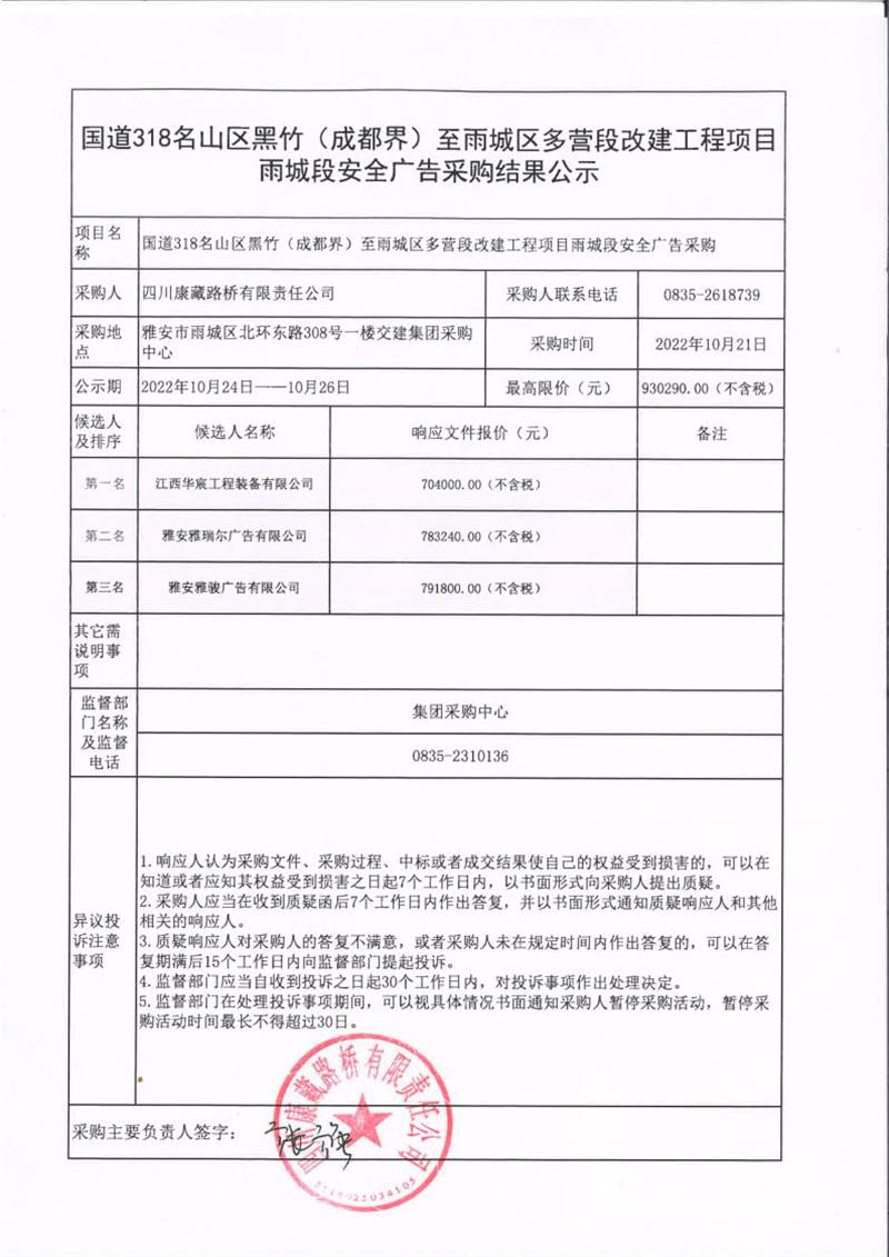 四川康藏路橋有限責任公司國道318名山區(qū)黑竹(成都界)至雨城區(qū)多營段改建工程項目雨城段安全廣告采購結(jié)果公示