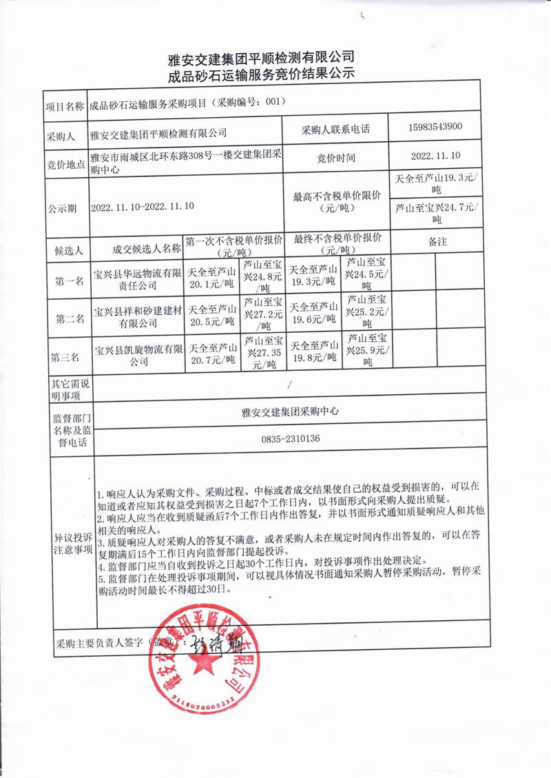 雅安交建集團(tuán)平順檢測有限公司成品砂石運輸服務(wù)競價結(jié)果公示