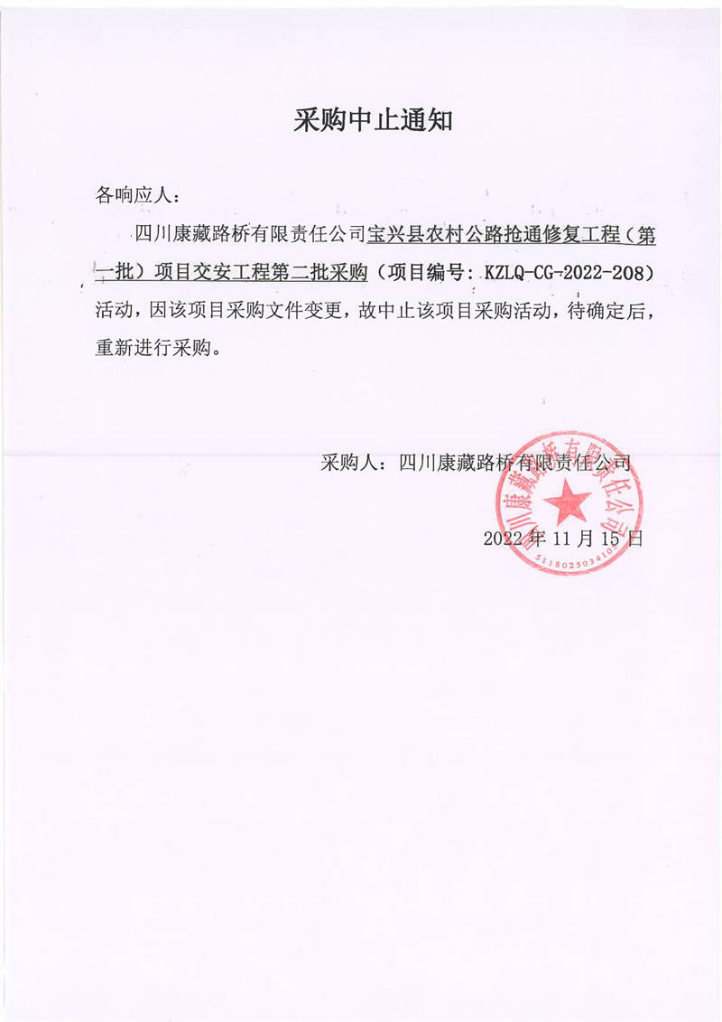 四川康藏路橋有限責(zé)任公司寶興縣農(nóng)村公路搶通修復(fù)工程(第一批)項(xiàng)目交安工程第二批采購中止通知