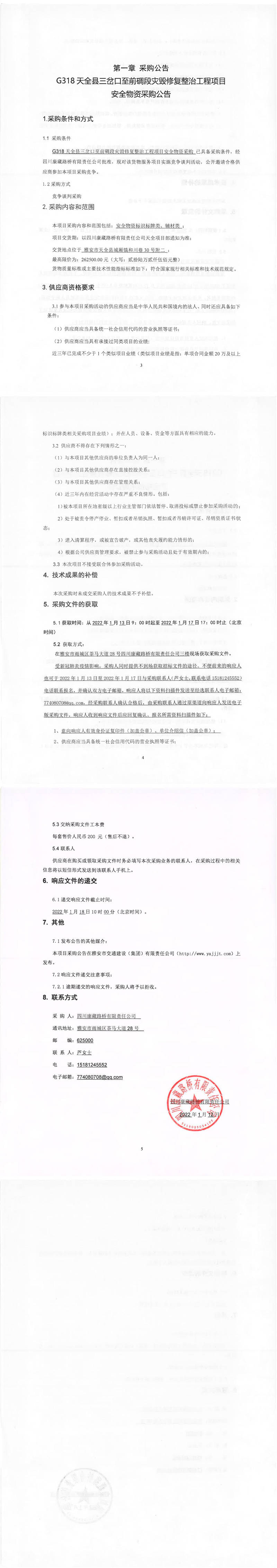 四川康藏路橋有限責(zé)任公司G318天全縣三岔口至前碉段災(zāi)毀修復(fù)整治工程項(xiàng)目安全物資采購(gòu)公告