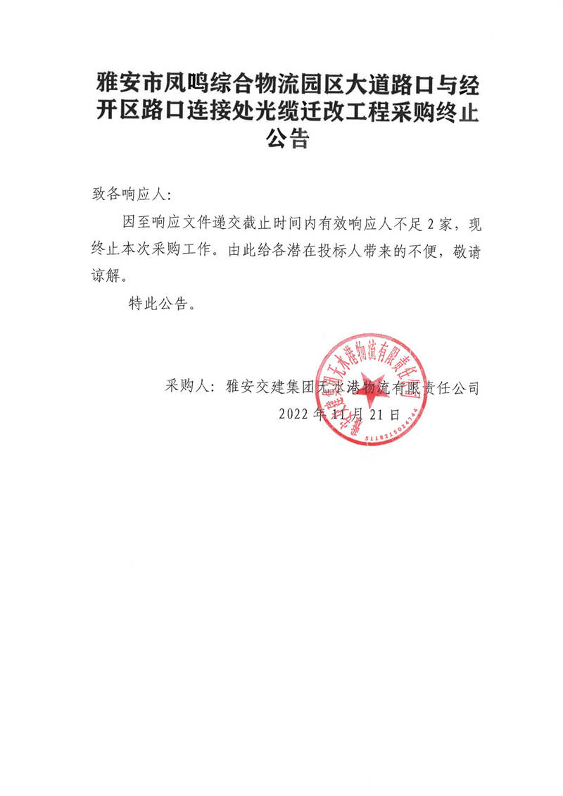 雅安交建集團(tuán)無(wú)水港物流有限責(zé)任公司雅安市鳳鳴綜合物流園區(qū)大道路口與經(jīng)開區(qū)路口連接處光纜遷改工程采購(gòu)終止公告