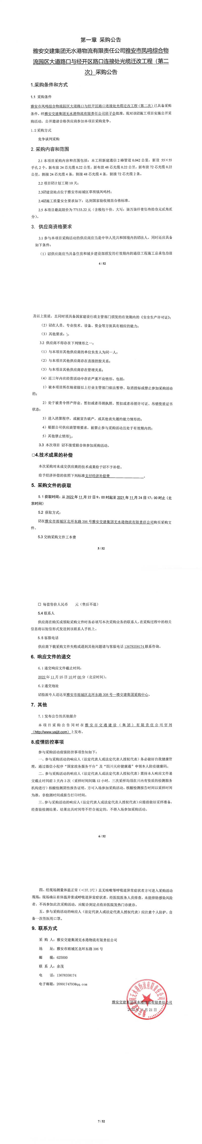 雅安交建集團(tuán)無水港物流有限責(zé)任公司雅安市鳳鳴綜合物流園區(qū)大道路口與經(jīng)開區(qū)路口連接處光纜遷改工程(第二次)采購公告