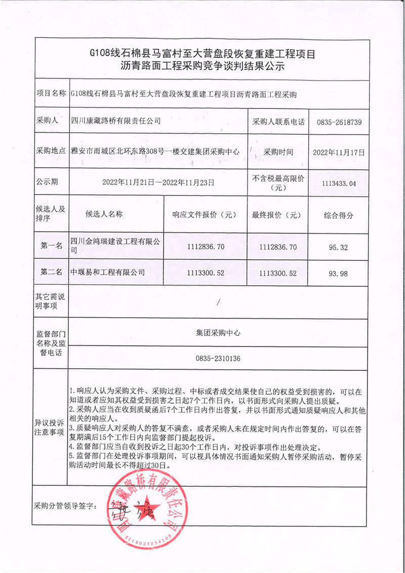 四川康藏路橋有限責任公司G108線石棉縣馬富村至大營盤段恢復(fù)重建工程項目瀝青路面工程采購競爭談判結(jié)果公示
