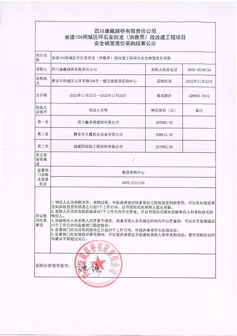 四川康藏路橋有限責(zé)任公司省道104雨城區(qū)坪石至回龍(洪雅界)段改建工程項(xiàng)目安全梯籠競(jìng)價(jià)采購結(jié)果公示