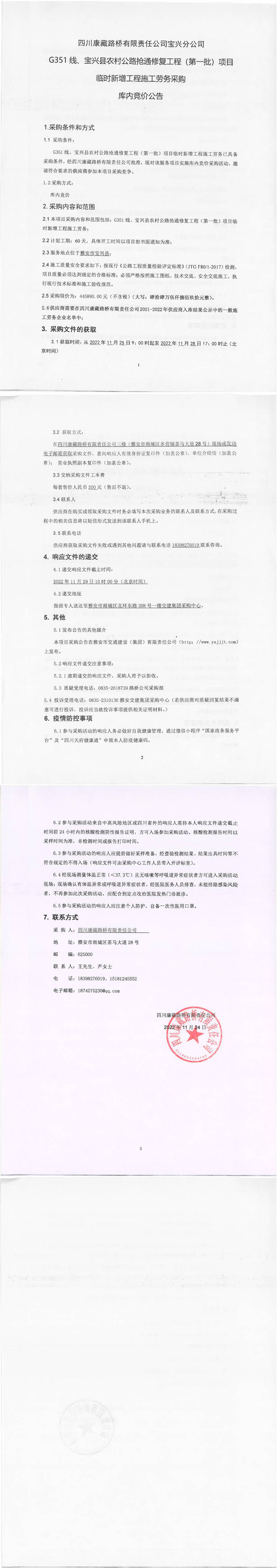 四川康藏路橋有限責(zé)任公司G351線、寶興縣農(nóng)村公路搶通修復(fù)工程(第一批)項(xiàng)目臨時(shí)新增工程施工勞務(wù)采購(gòu)庫(kù)內(nèi)競(jìng)價(jià)公告