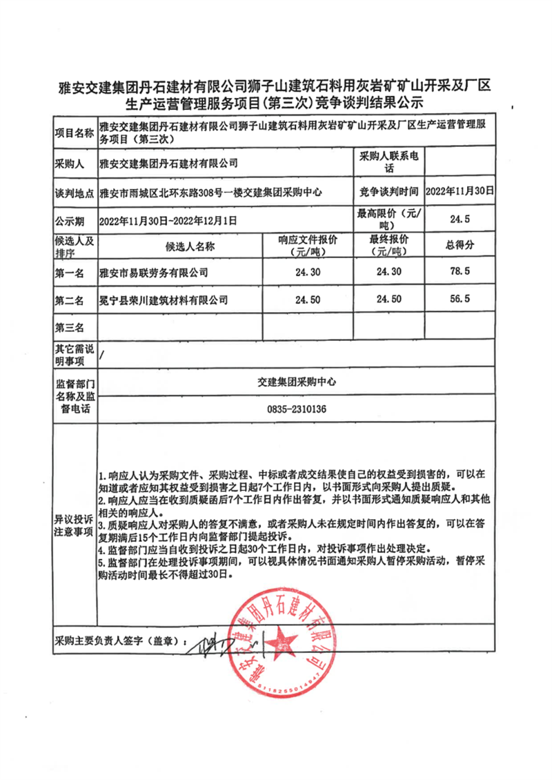 雅安交建集團(tuán)丹石建材有限公司獅子山建筑石料用灰?guī)r礦礦山開采及廠區(qū)生產(chǎn)運(yùn)營管理服務(wù)項目(第三次)競爭談判結(jié)果公示