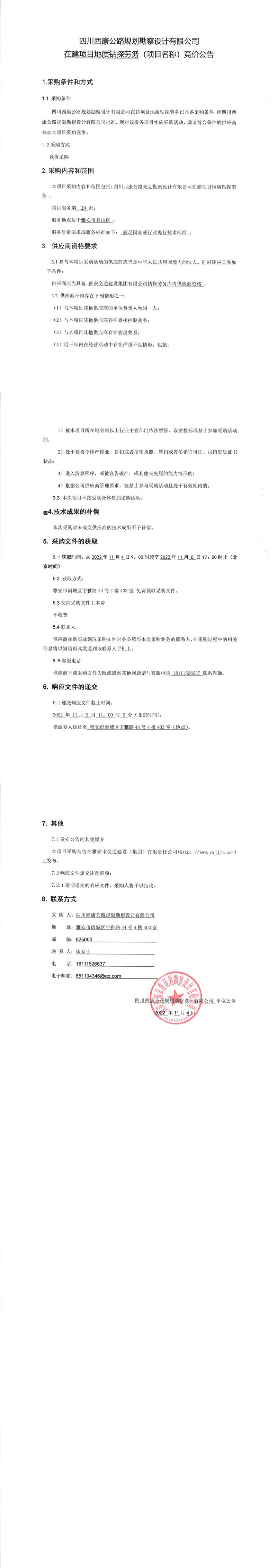 四川西康公路規(guī)劃勘察設(shè)計(jì)有限公司在建項(xiàng)目地質(zhì)鉆探勞務(wù)(項(xiàng)目名稱)競(jìng)價(jià)公告