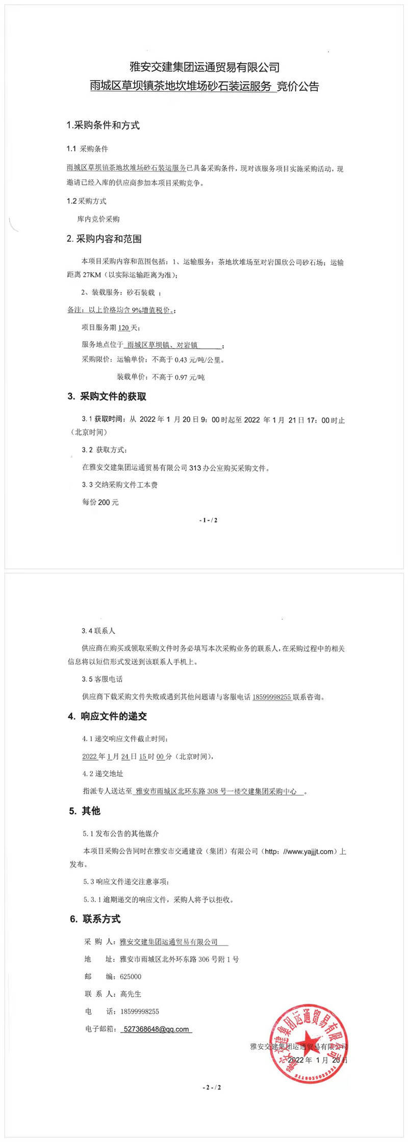 雅安交建集團運通貿(mào)易有限公司雨城區(qū)草壩鎮(zhèn)茶地坎堆場砂石裝運服務(wù)競價公告