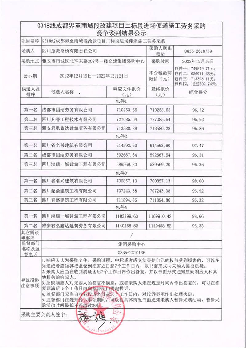 四川康藏路橋有限責(zé)任公司G318線(xiàn)成都界至雨城段改建項(xiàng)目二標(biāo)段進(jìn)場(chǎng)便道施工勞務(wù)采購(gòu)競(jìng)爭(zhēng)談判結(jié)果公示