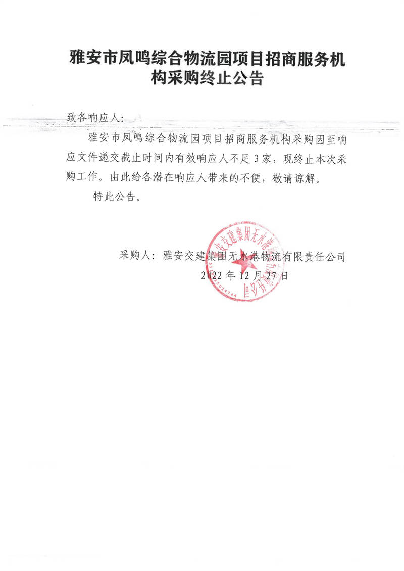 雅安交建集團無水港物流有限責任公司雅安市鳳鳴綜合物流園項目招商服務機構(gòu)采購終止公告