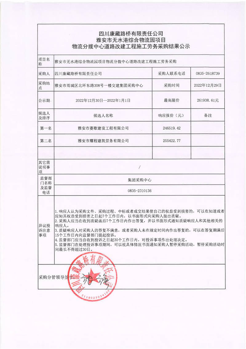 四川康藏路橋有限責(zé)任公司雅安市無水港綜合物流園項目物流分撥中心道路改建工程施工勞務(wù)采購結(jié)果公示