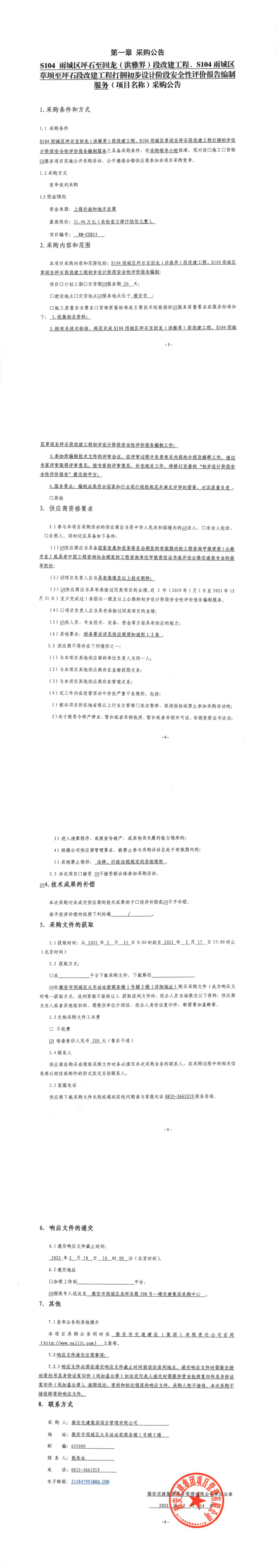雅安交建集團項目管理有限公司S104雨城區(qū)坪石至回龍(洪雅界)段改建工程、S104雨城區(qū)草壩至坪石段改建工程打捆初步設(shè)計階段安全性評價報告編制服務(wù)采購公告