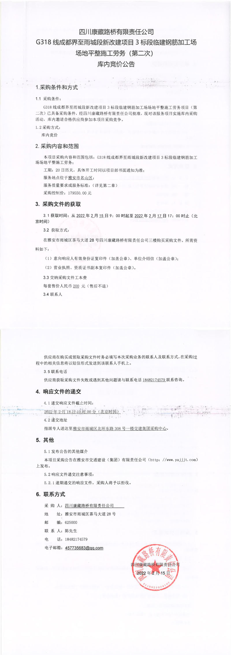 四川康藏路橋有限責任公司G318線成都界至雨城段新改建項目3標段臨建鋼筋加工場場地平整施工勞務(wù)(第二次)庫內(nèi)競價公告