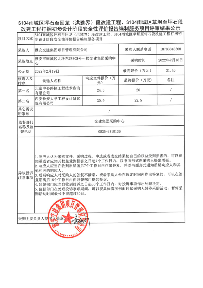 雅安交建集團項目管理有限公司S104雨城區(qū)坪石至回龍(洪雅界)段改建工程、S104雨城區(qū)草壩至坪石段改建工程打捆初步設計階段安全性評價報告編制服務項目評審結果公示