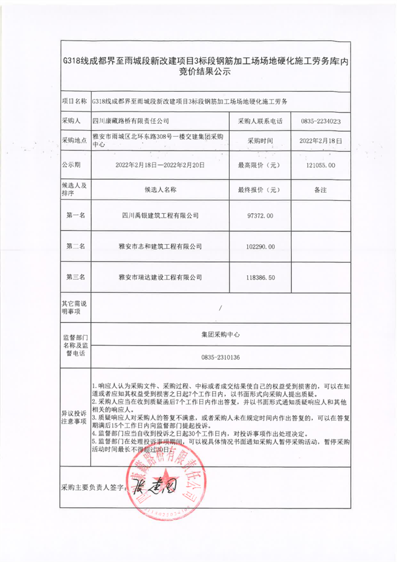 四川康藏路橋有限責(zé)任公司G318線成都界至雨城段新改建項(xiàng)目3標(biāo)段鋼筋加工場場地硬化施工勞務(wù)庫內(nèi)競價(jià)結(jié)果公示