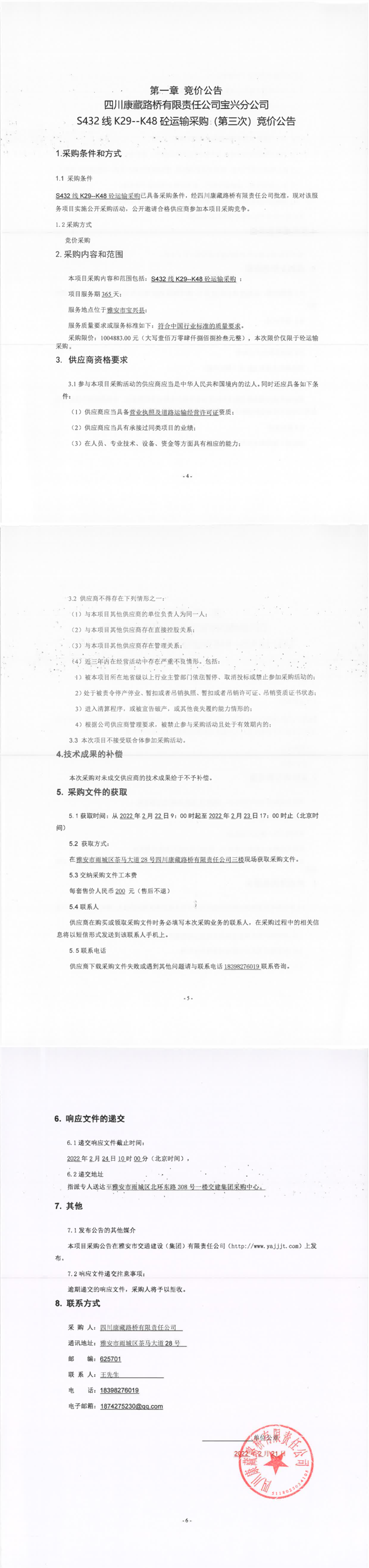 四川康藏路橋有限責(zé)任公司寶興分公司S432線K29-K48砼運(yùn)輸采購(第三次)競價公告