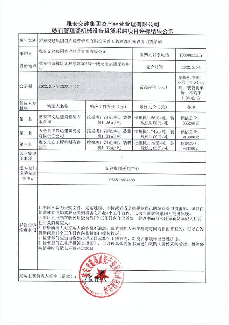 雅安交建集團(tuán)資產(chǎn)經(jīng)營管理有限公司砂石管理部機(jī)械設(shè)備租賃采購項(xiàng)目評(píng)標(biāo)結(jié)果公示