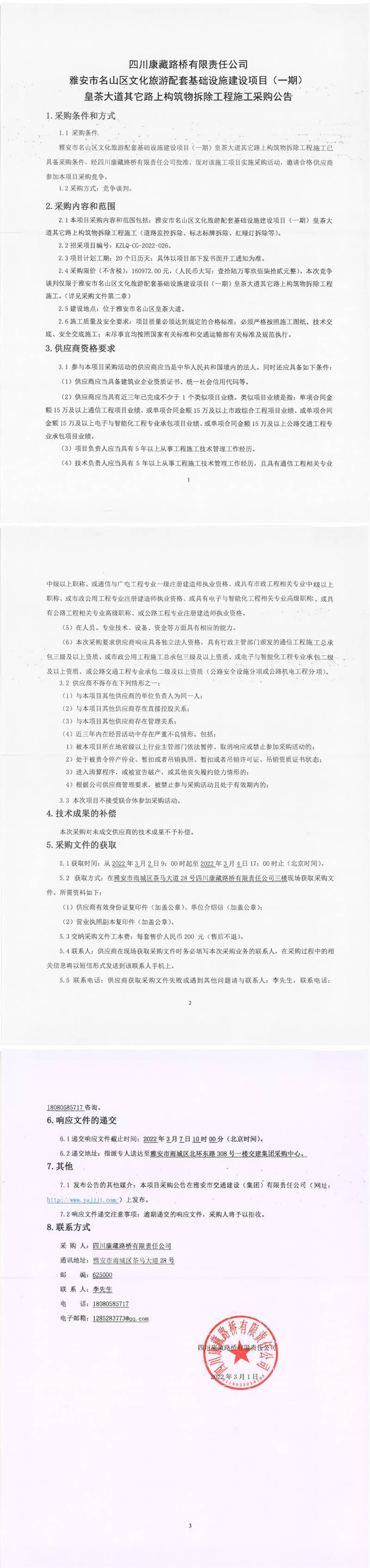 四川康藏路橋有限責任公司雅安市名山區(qū)文化旅游配套基礎(chǔ)設施建設項目(一期)皇茶大道其它路上構(gòu)筑物拆除工程施工采購公告